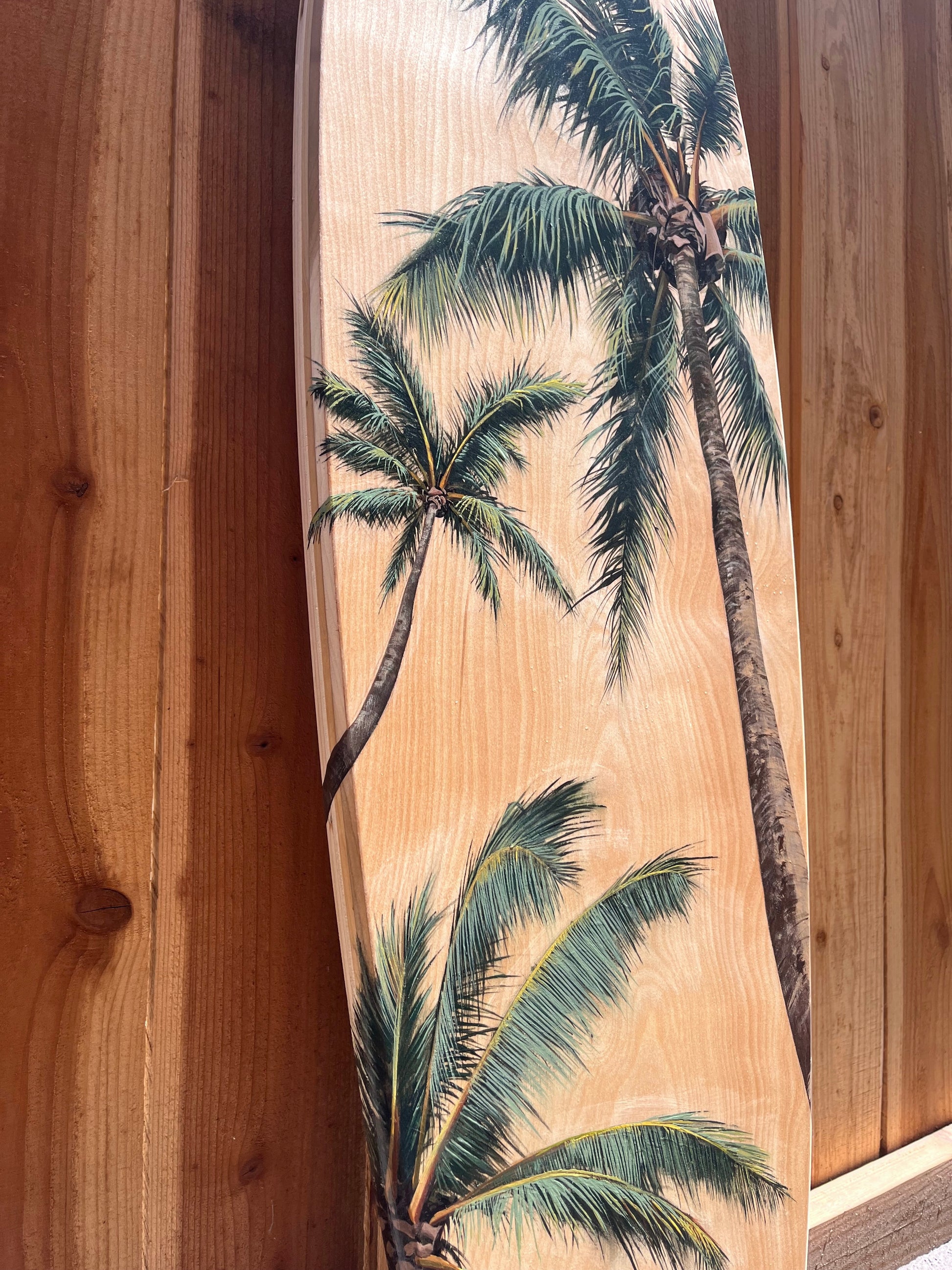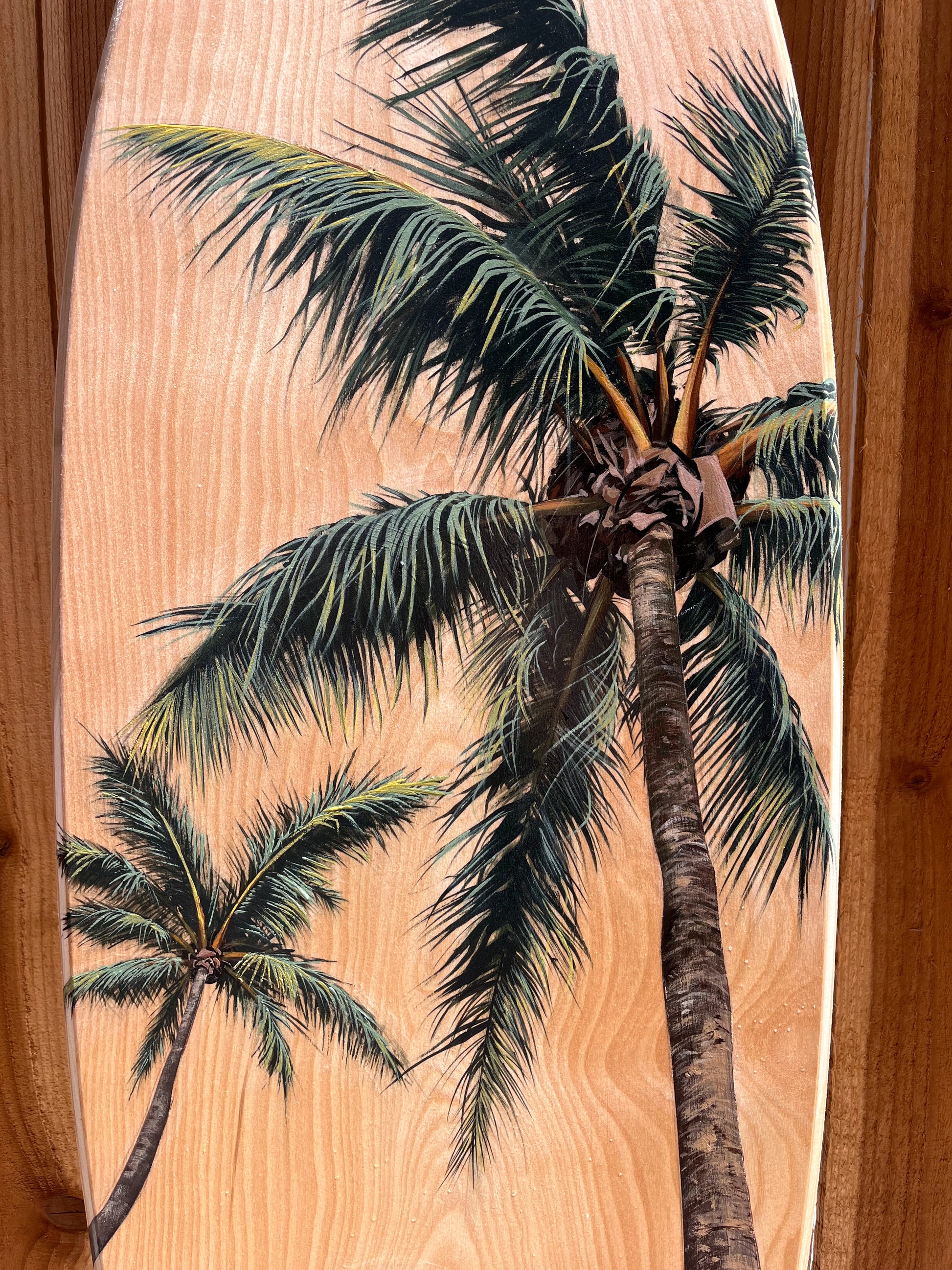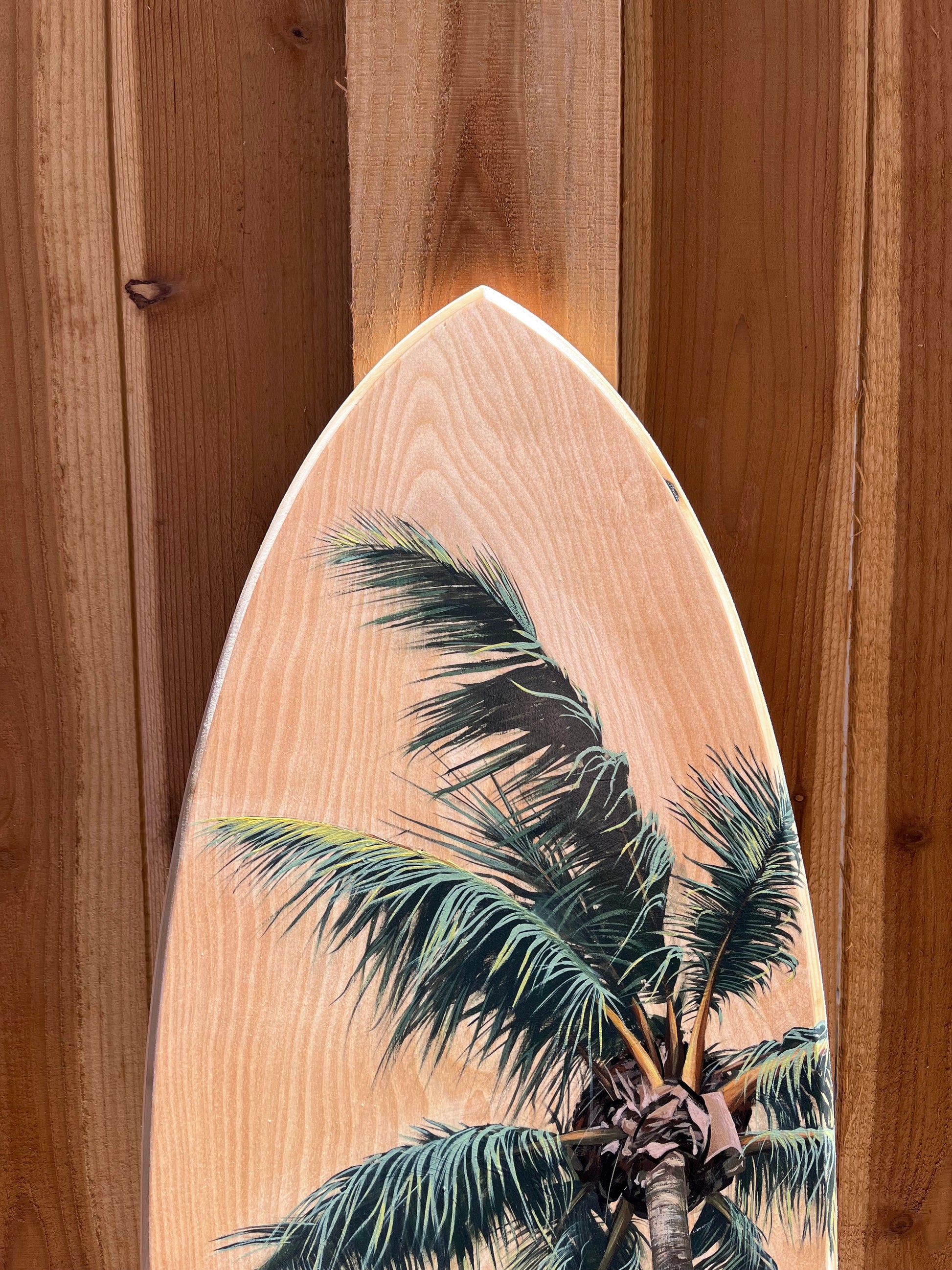 Original hand-painted acrylic on birch wood surfboard.