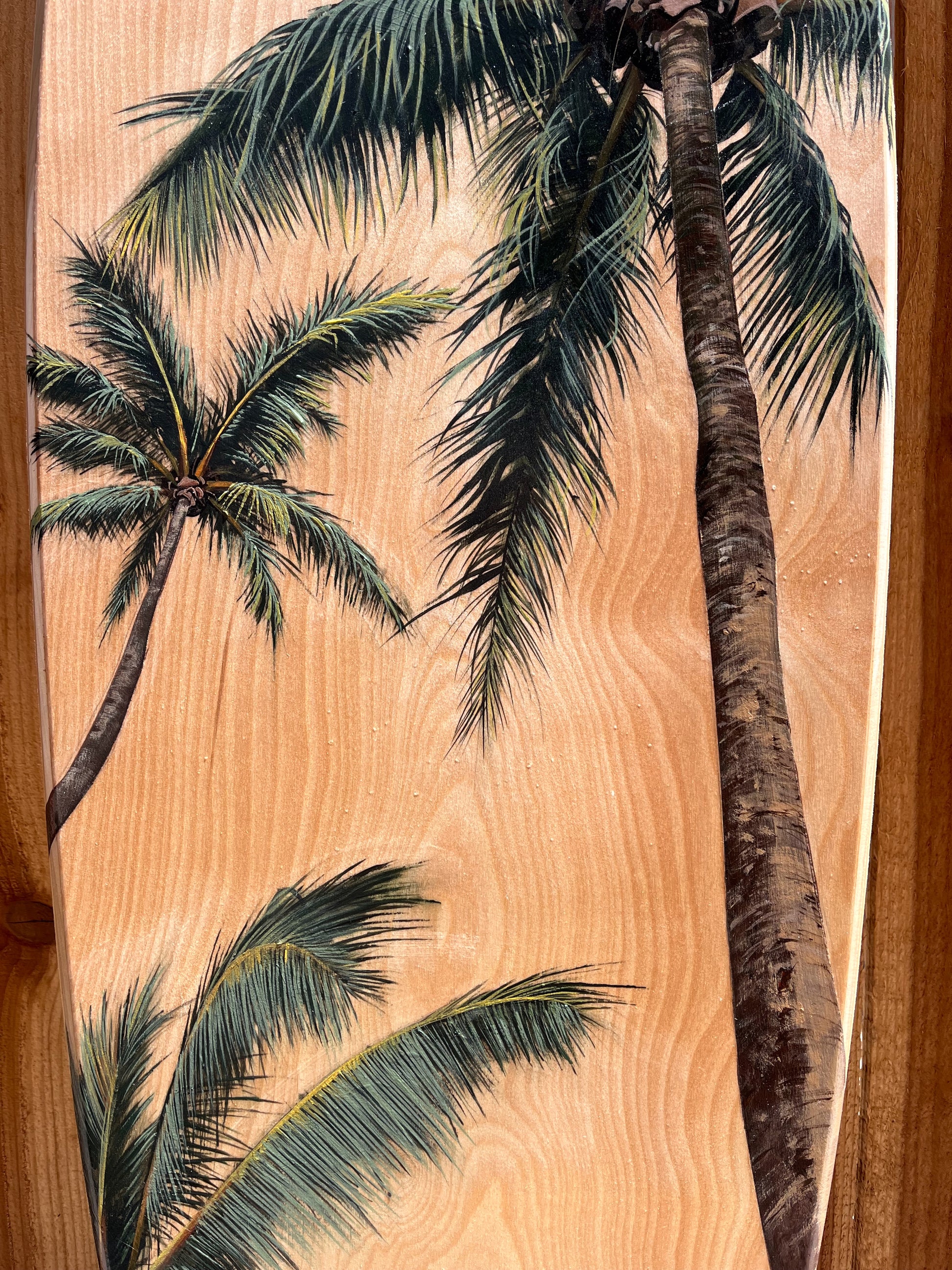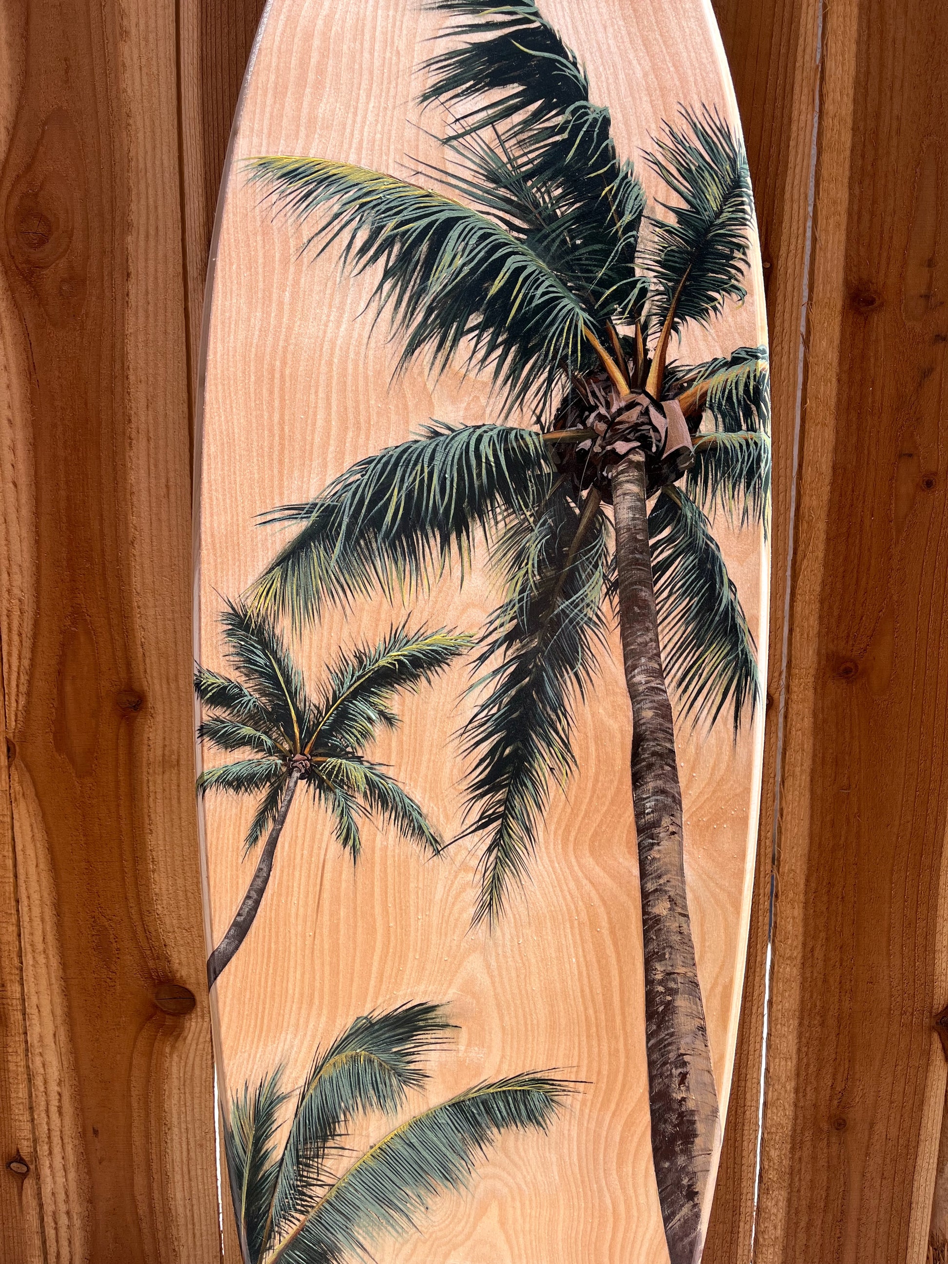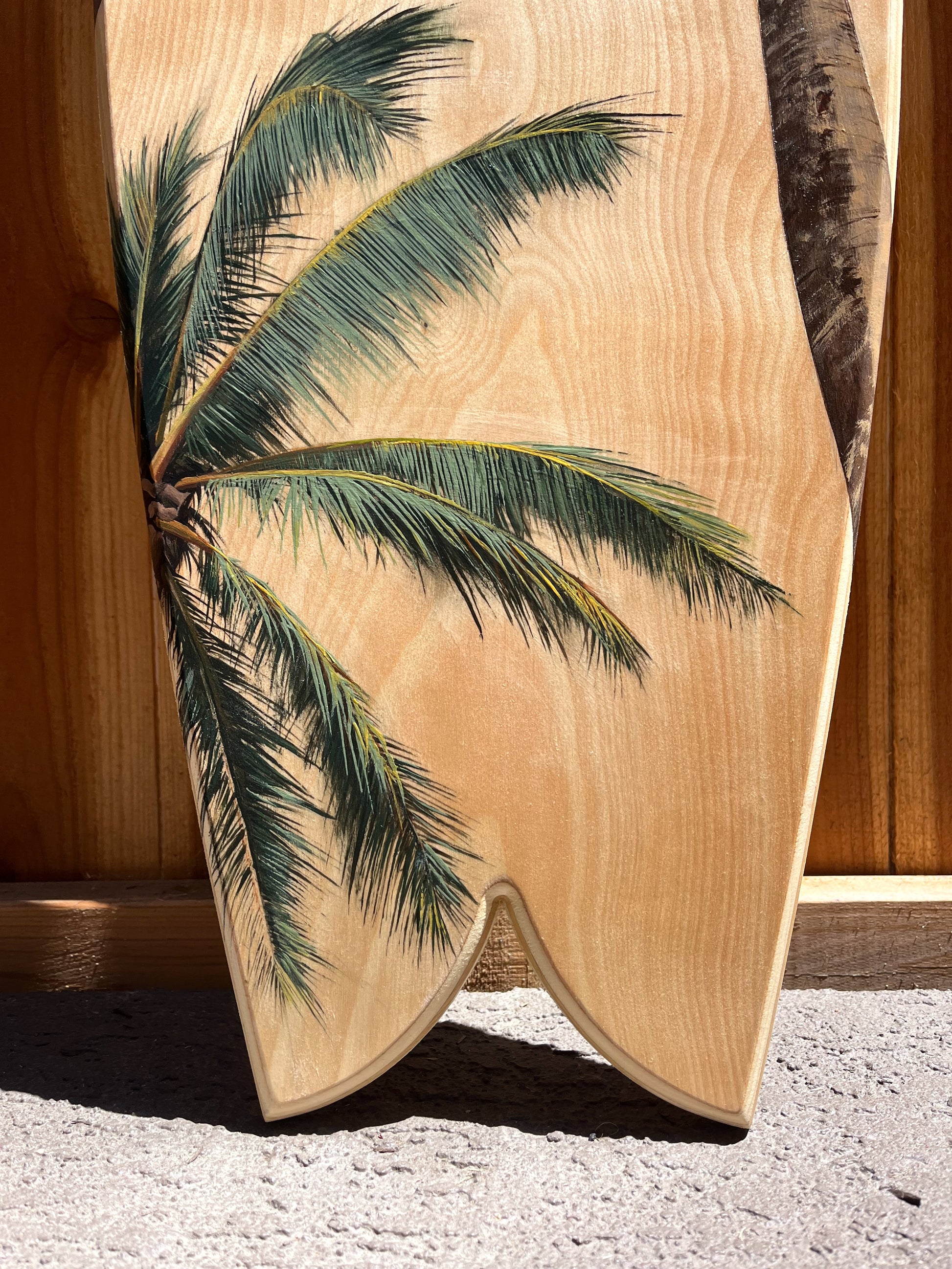 Original hand-painted acrylic on birch wood surfboard.